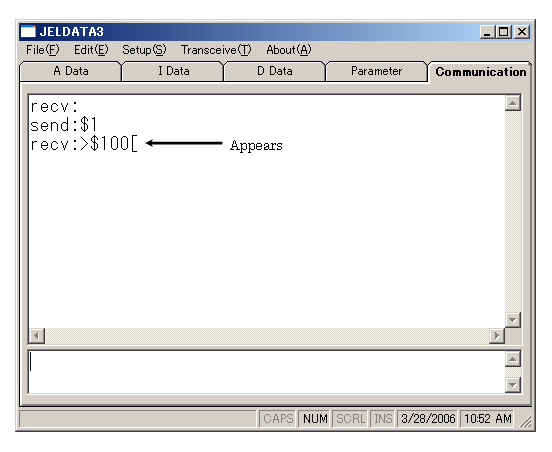 (4) When “recv:>$1**[“ appears on the last line in the response window, communication check is completed.